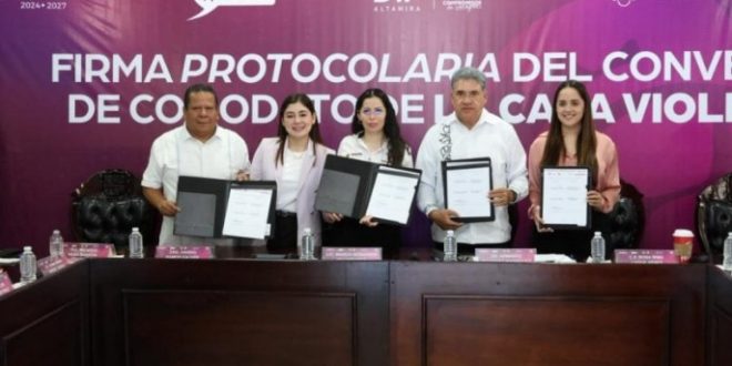 Altamira, Tamaulipas.– La directora general del Instituto de las Mujeres en Tamaulipas, Marcia Benavides Villafranca, informó sobre la firma del convenio de comodato de Casa Violeta en el municipio de Altamira, con el alcalde Armando Martínez Manríquez con el objetivo de continuar atendiendo, protegiendo y acompañando a mujeres en situación de violencia.